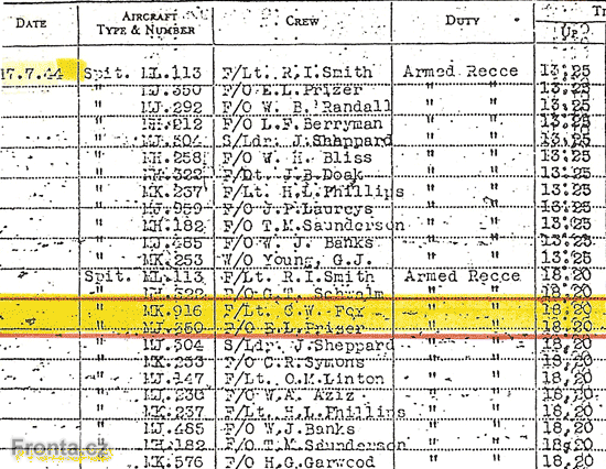 Znovu jsem tedy použil internet a „vygoogloval“ hned několik dalších zajímavých verzí útoku. Na anglické wikipedii jsem narazil na článek o kanadském pilotovi z druhé světové války. V článku bylo psáno, že podle nejnovějších šetření byl za útočníka na Rommelův vůz označen právě tento Kanaďan, Charles Fox. Na přidaném odkazu jsem našel jeho vzpomínky na 17. červenec 1944. Po přečtení textu jsem však nebyl přesvědčen, že Flight Lieutenant (dále jen F/Lt) Charles Fox, DFC&Bar je ten pravý útočník, a proto jsem neváhal napsat autorovi tohoto webu e-mail s několika zvídavými dotazy. Po týdnu mi přišla odpověď s vysvětleními a dokonce s adresou na výše zmíněného pilota. Opět jsem se dlouho nerozmýšlel a ihned jsem napsal dopis s dalšími prosbami a dotazy (toto vše proběhlo v září 2006). Po půl roce, když jsem již přestal doufat v odpověď a celý případ jsem odložil ad acta, přišel vytoužený dopis. Dnes již 87letý Charles Fox nešetřil materiály ani papírem. Dozvěděl jsem se hned několik nových podrobností o jeho letu z 17. července 1944 a v přidaných materiálech jsem našel okopírovaný záznam z Operations Record Book (dále jen ORB) jednotky,3 u níž F/Lt Charles Fox, DFC&Bar bojově létal. Poté jsem objevil okopírovaný záznam z jeho osobního letového deníku (Pilot´s Flying Log Book — PFLG). Proto jsem se rozhodl, že bych tyto materiály mohl využít a sestavit kratší článek o 17. červenci 1944, ve kterém bych čtenářům nastínil průběh útoku a sumarizoval získané poznatky.