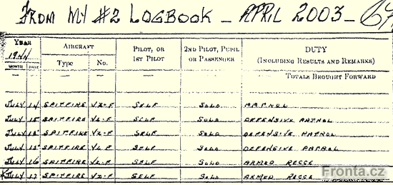 Pilot´s Flying Log Book F/L Foxe z 17. července 1944 — ozbrojený průzkum, doba trvání: 1 hodina a 15 minut, 1 štábní auto poškozeno (později dopsáno: !Rommel — Yes)