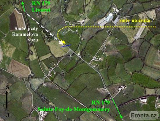 Mapa pravděpodobného útoku na Rommelův vůz vyrobená ze satelitního snímku silnice RD 579 mezi Livarot a Sainte-Foy-de-Montgommery.