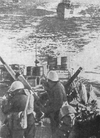 I přes veškeré úspěchy v boji a utajování příchodu na scénu musely lodě AVF kromě ostřelování pobřežních cílů také současně válčit s nepřátelskými loďmi, které vyrazily z napadeného přístavu do protiútoku. Nepřátelské čluny se ale po několika přímých zásazích dělovými granáty ze sovětských lodí, které byly před nenadálým výpadem včas varovány hlídkujícími letadly, rychle stáhly zpět do přístavu pod ochranu tamních baterií.