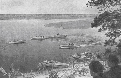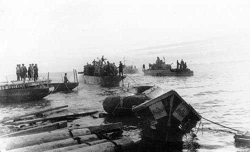 Vzácný snímek pontonového mola z úseku Žukovka. Zde je dobře vidět, jak a s čím se Sověti vyloďovali - v popředí rybářská veslice ještě s německým označením a velká ženijní dinghy, vlevo čeká na vylodění obrněný dělový člun BKA typu Projekt 1124. Vpravo se už další čluny typu BKA po vysazení desantu na provizorní molo vracejí za ranní mlhy na východní stranu úžiny. Vycházející slunce je možno v oparu na východě matně zahlédnout