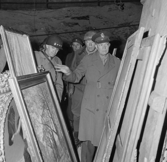Eisenhower, Bradley a Patton si prohlížejí umělecká díla nalezená v solných dolech Merkers
