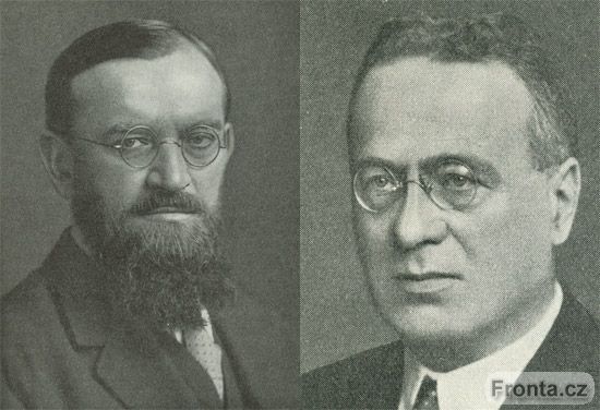 Vlevo Ladislav František Dvořák - od února 1939 guvernér NBČS, v letech 1939-45 guvernér Národní banky pro Čechy a Moravu, vpravo vrchní ředitel František Peroutka, který 18. března 1939 podepsal příkaz k převodu zlata (foto: Deset let NBČS)