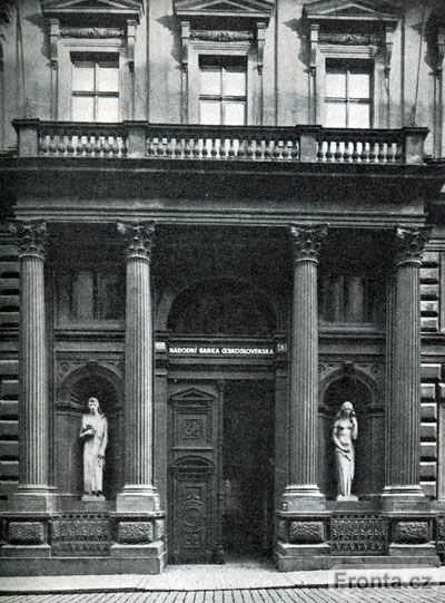 Vstupní portál budovy Národní banky Československé v Bredovské ulici, dnes ulice Politických vězňů (foto: Deset let NBČS)