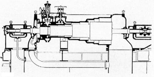 Parsonsova turbína od PBS ze začátku 20. století — ukázka uspořádání tehdejších nízkotlakých turbín přetlakového uspořádání, tak jak je vyráběla PBS okolo roku 1905 v Parsonsově licenci