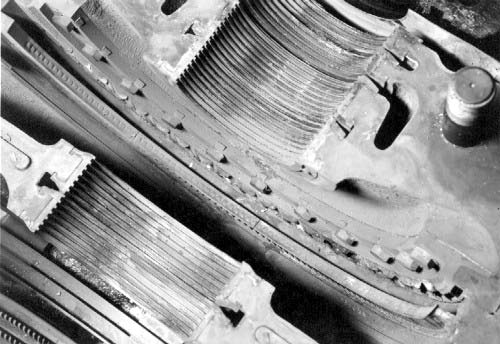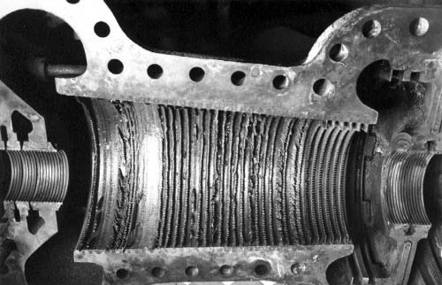 Rotor havarované turbíny, stator havarované turbíny, detail ucpávky statoru — sada fotografií ukazuje následky havárie turbíny poměrně malého výkonu někdy ve třicátých letech