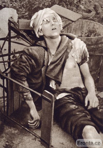 Dne 7. května t.r. postavili esesáci jiného našeho zajatce v civilu na nástupiště před právnickou fakultou na část ozářenou sluncem, aby bylo naň dobře viděti ve směru naší palebné linie ze Staroměstského náměstí. Z oblouku před právnickou fakultou tomuto civilistovi poroučeli různě se pohybovati. To trvalo nejméně dvě a půl hodiny, než jej rána ze směru Staroměstského náměstí připravila o život.
