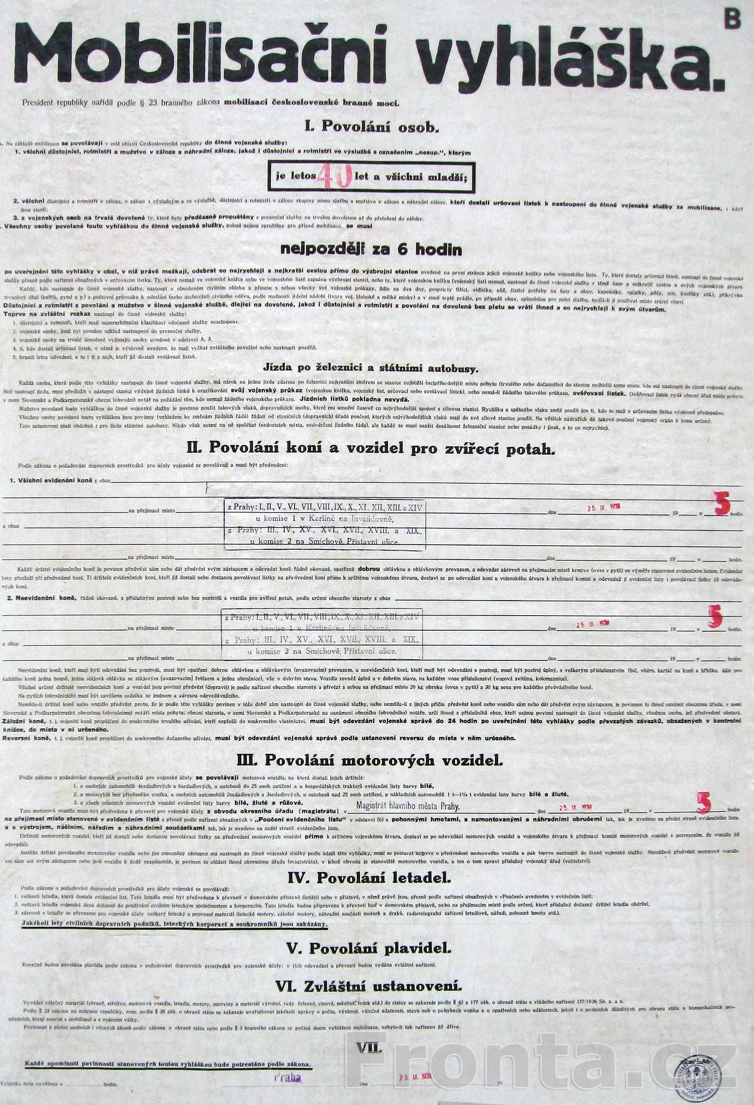 Ráno 24. září 1938 se v ulicích měst a obcí po celém Československu objevila dlouho očekávaná mobilizační vyhláška. O průběhu mobilizace viz zprávy ministerstva vnitra.