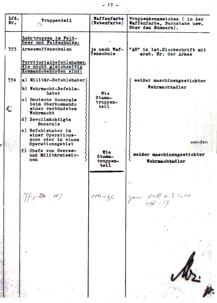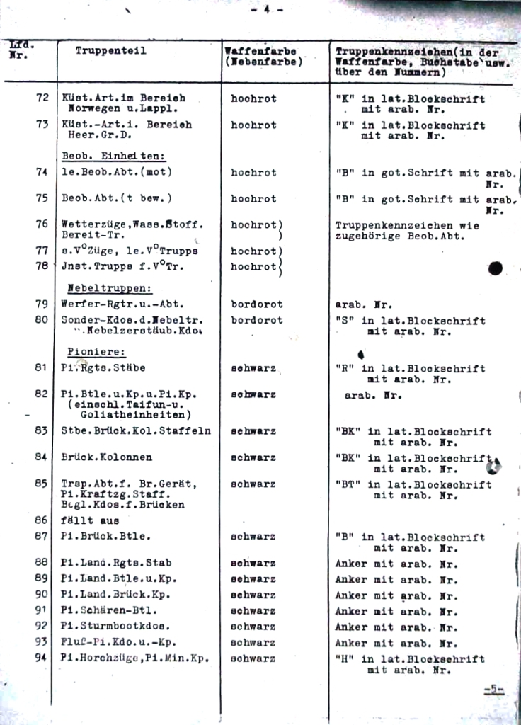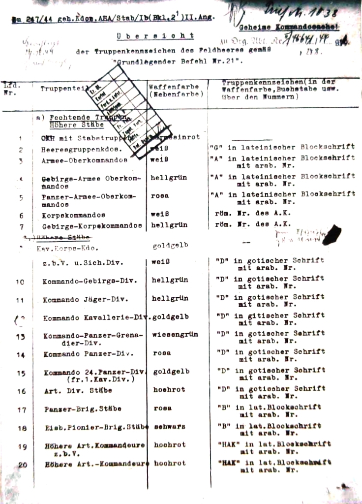 Přehled označování útvarů polní armády vydaný Všeobecným armádním úřadem (AHA / Allgemeine Heeresamt) jako příloha k Základnímu rozkazu č. 21, který již obsahuje změny zavedené rozkazem z 29. listopadu 1944. Jedná se o zařazení nových položek č. 6a, 53a, 53b, 53c, 53d; a o úpravy položek č. 26, 27, 106a, 152, 153, 154, 156-172, 325-335. Přílohou k tabulce je pak grafické znázornění jednotlivých typů písmenných zkratek a znaků.