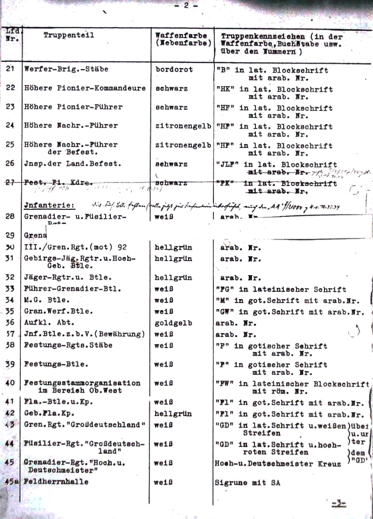 | 44 | fyzilírský pluk "Großdeutschland" | bílá | "GD" v latinském stylu a jasně červeným lemováním nad a pod GD |