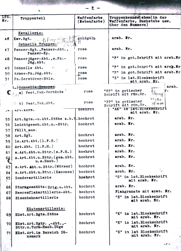| 48 | oddíly stíhačů tanků, těžké oddíly stíhačů tanků | růžová | "P" v gotickém stylu s arabskou číslicí |