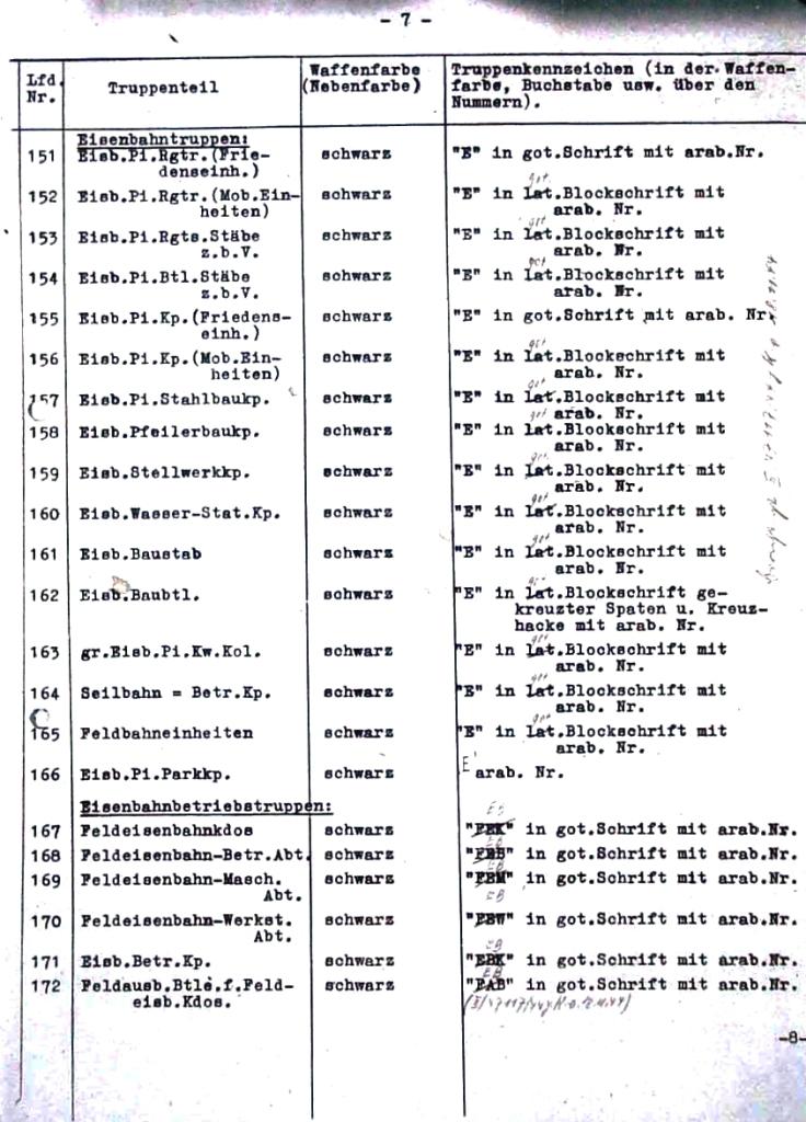 | 18 | štáby železničních ženijních brigád | černá | "B" v latinském stylu s arabskou číslicí |
