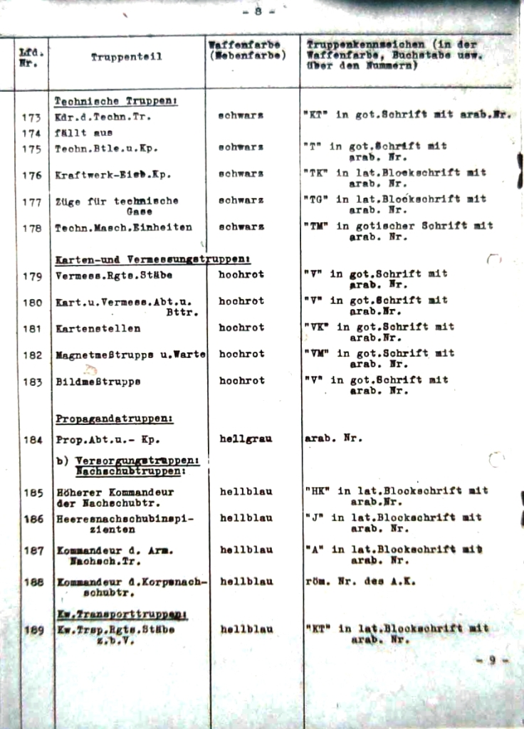 | 9 | velitelství divizí pro zvláštní účely a zajišťovacích divizí | bílá | "D" v gotickém stylu s arabskou číslicí |