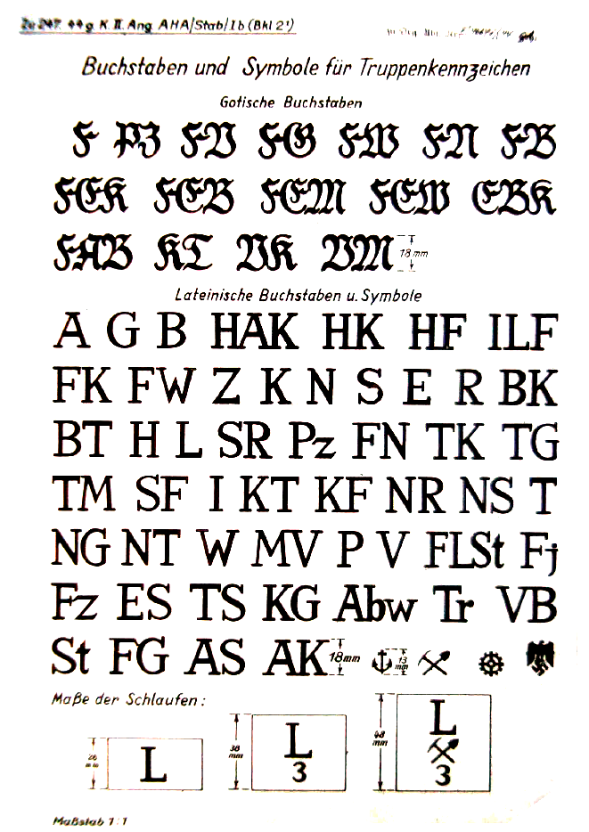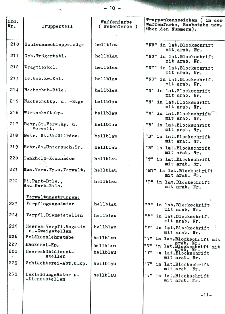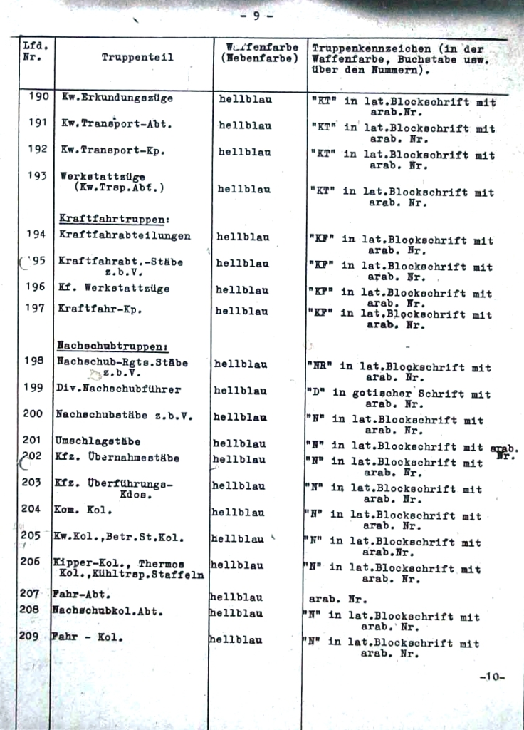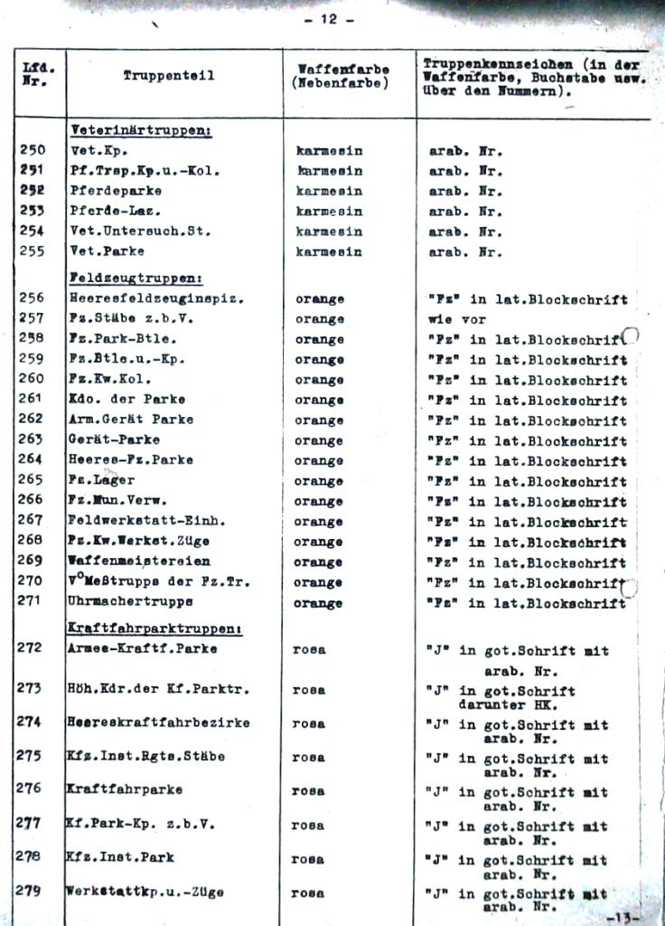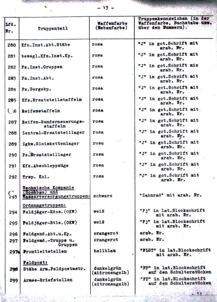 | 294 | velitelství polních myslivců (OKW) | bílá | "Fj" v latinském stylu s arabskou číslicí |