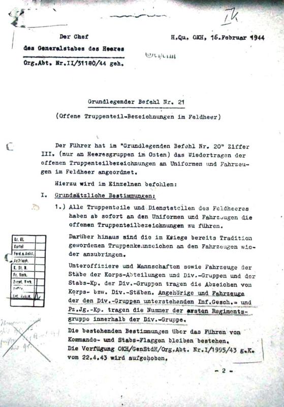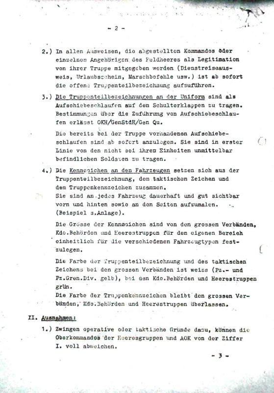 Rozkaz vydaný Organizačním oddělením Velitelství pozemní armády (Org.Abt./OKH) o znovuzavedení viditelného označování útvarů polní armády. Měl umožnit rychlou identifikaci armádního personálu vojenskou policií, kterýžto požadavek převážil nad snahou pokud možno co nejvíce ztížit nepříteli identifikaci druhů vojsk, které proti němu stojí.