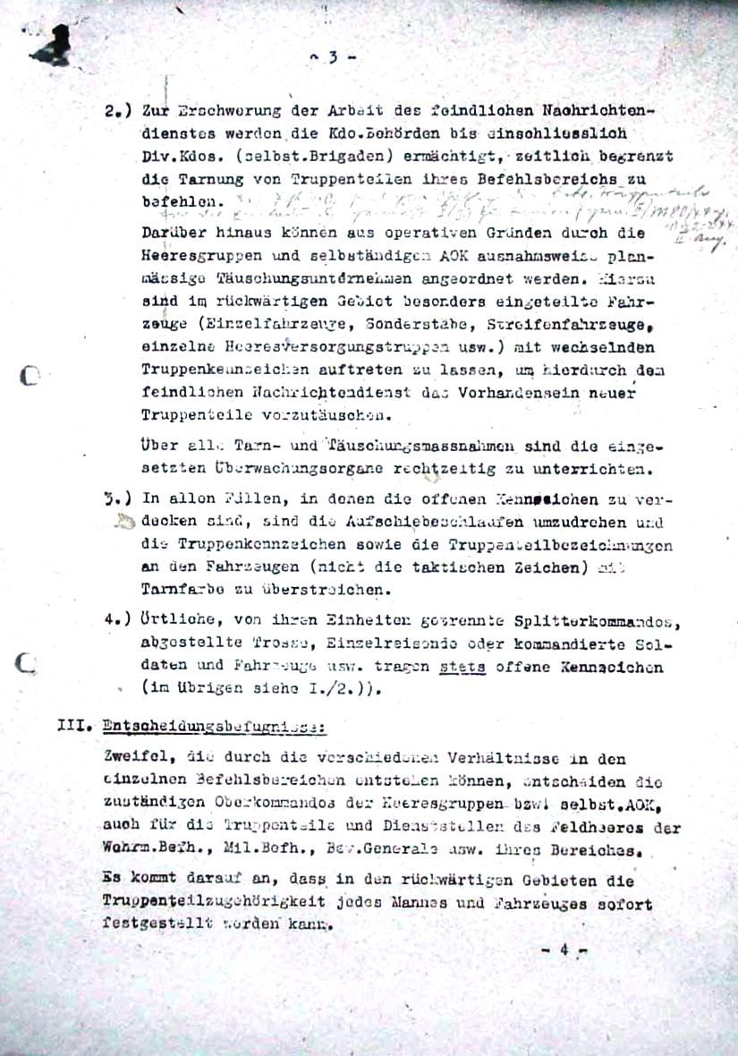 | Kromě toho mohou ve výjimečných případech skupiny armád a samostatné armády z operačních důvodů provádět plánovaná klamná opatření. Z toho důvodu se v týlové oblasti rozmístí zvláště vybraná vozidla (jednotlivé vozy, speciální štáby, policejní vozy, jednotlivé armádní zásobovací jednotky atd.) s vyměnitelnými označeními útvarů, čímž se pro nepřátelskou zpravodajskou službu předstírá přítomnost nových jednotek. | |||||||||
