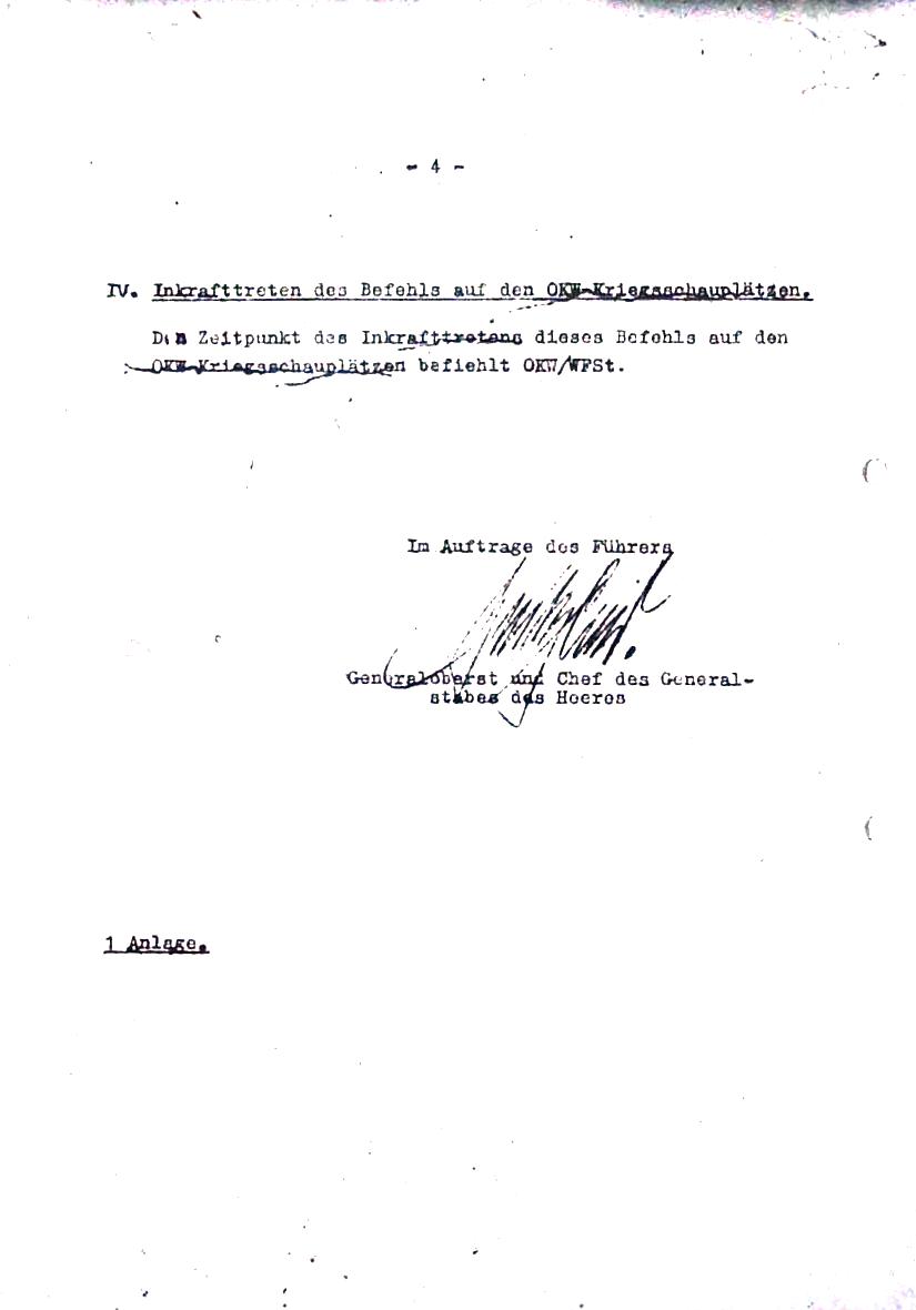 | Datum nabytí účinnosti tohoto rozkazu na bojištích řízených OKW vydá OKW / Hlavní štáb branné moci. | |||||||||