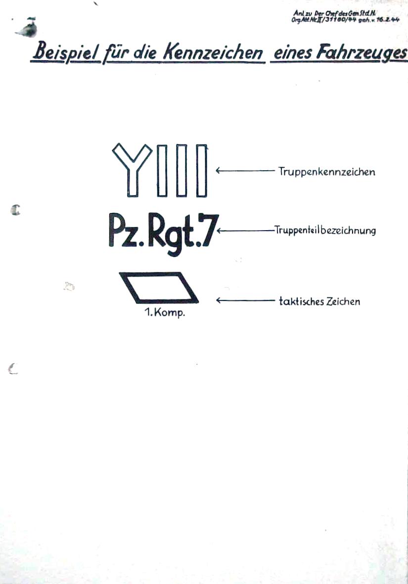 | Poddůstojníci a mužstvo stejně jako vozidla štábů sborových oddílů a divizních skupin a štábních rot divizních skupin ponesou označení sborových resp. divizních štábů. Příslušníci a vozidla rot pěchotních děl a protitankových rot, podřízených divizním skupinám, ponesou číslo první plukovní skupiny v divizní skupině. | |||||||||
