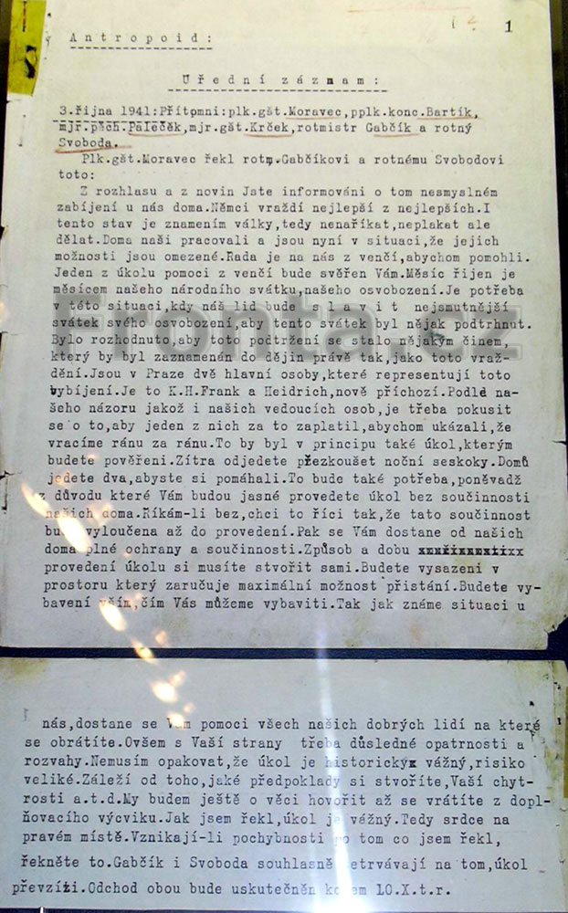 Z rozhlasu a novin Jste informováni o tom nesmyslném zabíjení u nás doma. Němci vraždí nejlepší z nejlepších. I tento stav je znamením války, tedy nenaříkat, neplakat ale dělat. Doma naši pracovali a jsou nyní v situaci, že jejich možnosti jsou omezené. Řada je na nás z venčí, abychom pomohli. Jeden z úkolu pomoci z venčí bude svěřen Vám. Měsíc řijen je měsícem našeho národního svátku, našeho osvobození. Je potřeba v této situaci, kdy náš lid bude s l a v i t nejsmutnější svátek svého osvobození, aby tento svátek byl nějak podtrhnut. Bylo rozhodnuto, aby toto podtržení se stalo nějakým činem, který by byl zaznamenán do dějin právě tak, jako toto vraždění. Jsou v Praze dvě hlavní osoby, které representují toto vybíjení. Jsou to K. H. Frank a Heidrich [sic!], nově příchozí. Podle našeho názoru jakož i našich vedoucích osob, je třeba se pokusit o to, aby jeden z nich za to zaplatil, abychom ukázali, že vracíme ránu za ránu. To by byl v principu také úkol, kterým budete pověřeni. Zítra odjedete přezkoušet noční seskoky. Domů jedete dva, abyste si pomáhali. To bude také potřeba, poněvadž z důvodu které Vám budou jasné provedete úkol bez součinnosti našich doma. Říkám-li bez, chci to říct tak, že tato součinnost bude vyloučena až do provedení. Pak se Vám dostane od našich doma plné ochrany a součinnosti. Způsob a dobu provedení úkolu si musíte stvořit sami. Budete vysazeni v prostoru který zaručuje maximální možnost přistání. Budete vybaveni vším, čím Vás můžeme vybaviti. Tak jak známe situaci u nás, dostane se Vám pomoci všech našich dobrých lidí na které se obrátíte. Ovšem z Vaší strany třeba důsledné opatrnosti a rozvahy. Nemusím opakovat, že úkol je historicky vážný, risiko veliké. Záleží od toho, jaké předpoklady si stvoříte, Vaší chytrosti a.t.d. My budem ještě o věci hovořit až se vrátíte z doplňovacího výcviku. Jak jsem řekl, úkol je vážný. Tedy srdce na pravém místě. Vznikají-li pochybnosti po tomco jsem řekl, řekněte to. Gabčík i Svoboda souhlasně setrvávají na tom, úkol převzíti. Odchod obou bude uskutečněn kolem 10.X.t.r.