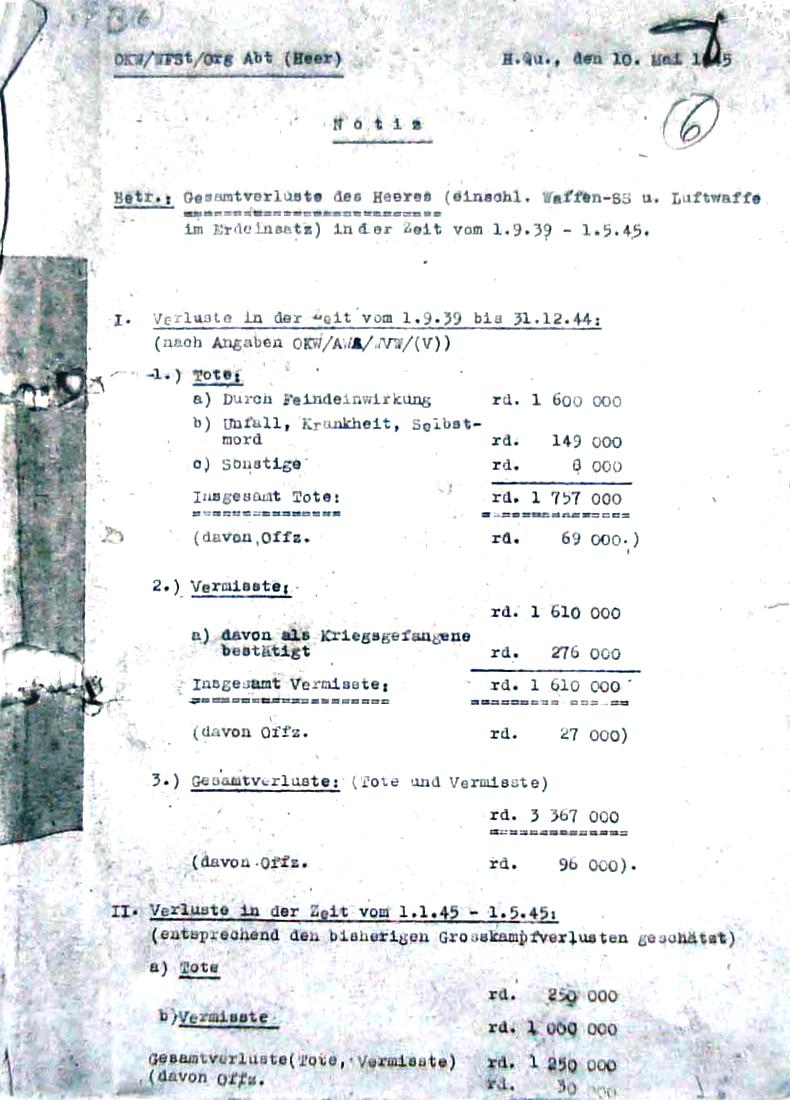 | Věc: Celkové ztráty pozemního vojska (vč. jednotek Waffen-SS a Luftwaffe nasazených v pozemních bojích) v období od 1.9.39 – 1.5.45. | |||