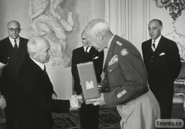 Generál George S. Patton přebírá od prezidenta Edvarda Beneše Řád Bílého lva I. třídy.