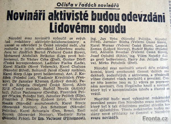 Po druhé světové válce bylo za svoji činnost za protektorátu před mimořádné lidové soudy postaveno 84 novinářů (z nich 26 před Národní soud) a dalších 34 bylo vyloučeno ze Svazu českých novinářů. Osm kolaborantských novinářů bylo odsouzeno k trestu smrti (A.J. Kožíšek, A. Kříž, R. Novák popraveni 26. března 1947, V. Krychtálek a K. Werner popraveni 22. dubna 1947, J. Křemenovi byl trest změněn na doživotí a E. Vajtauer a O. Polívka byli odsouzeni v nepřítomnosti). Další byli potrestáni mnohaletými tresty (V. Crha doživotí, H. Tuskány doživotí, G. Dörfl 20 let, E. Šourek 15 let, V. Ryba 10 let apod.).