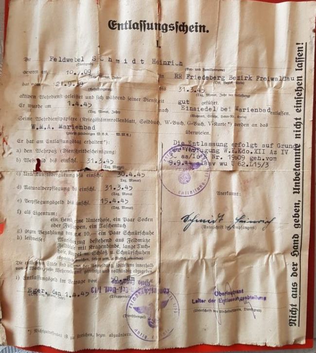 Jeho služební doklady byly předány na Wehrmeldeamt Marienbad (Branný přihlašovací úřad Mariánské Lázně).