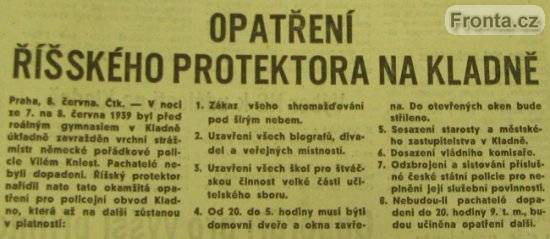 4 Když byla 19. ledna 1942 jmenována nová protektorátní vláda v čele s Jaroslavem Krejčím, dal tehdejší zastupující říšský protektor Reinhard Heydrich souhlas s propuštěním zatčených osob po tzv. Kladenském případu a studentů po demonstraci 17. listopadu 1939. Čtyři z kladenských obyvatel však v koncentračních táborech zemřeli.