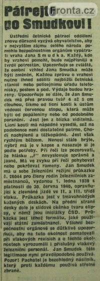 Obyvatelstvo se vyzývá důtklivě, aby ihned upozornilo bezpečnostní orgány, kdyby byl Smudek někde spatřen. každý, kdo by vrahovi Smudkovi nějak pomáhal, bude nejpřísněji a tvrdě potrestán. Pomoci k jeho dopadení je občanskou povinností každého Čecha.“