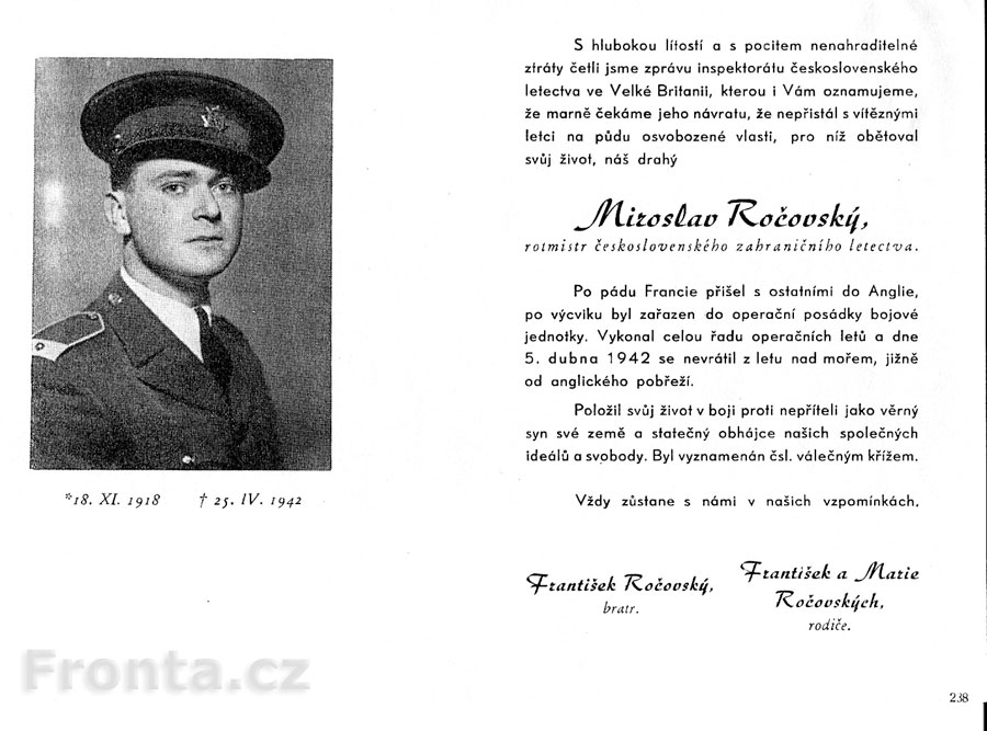 - Sgt. Miloslav Ročovský (křestní jméno Miloslav je uváděno J. Rajlichem podle oficiálních dobových dokumentů a na oficiální stránce http://www.army.cz/acr/raf/seznam/r.htm , spolubojovník citovaný J. Rajlichem užívá jméno Miloš, dále v knize F. Louckého "Mnozí nedoletěli" je křestní jméno Miroslav a Vy, jako rodinný příslušník, uvádíte křestní jméno František)