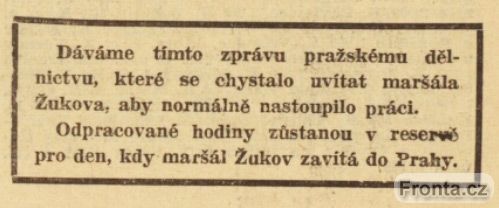 Na možnou návštěvu maršála Žukova v Praze v září 1945 již obyvatele připravoval