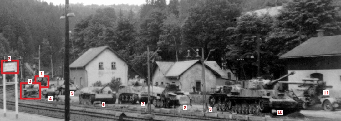Co se týká určení typu techniky, pak se jedná o tyto stroje: 1. PzKpfw "Panther" ¦ 2. JgPz IV/70 ¦ 4. - pravděpodobně SdKfz 250 ¦ 5. PzKpfw „Panther“ ¦ 6. JgPz IV/70 ¦ 7. M4 Sherman ¦ 8. SdKfz 251/9 Ausf. D ¦ 9. StuG III ¦ 10. PzKpfw IV ¦ 11. Flak 8,8 cm M36/37