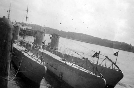 Ponorky U-9, U-14 a U-89 u mola v německém přístavu