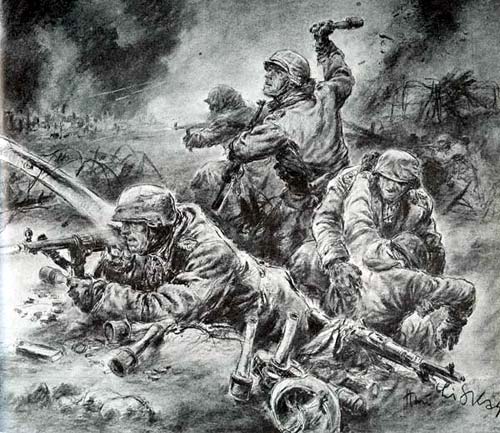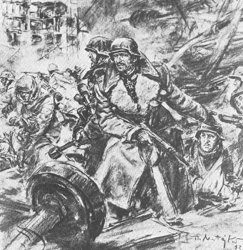 Jde o kresbu Theo Matejky z časopisu Die Wehrmacht, která má zobrazovat „heroický boj generála bok po boku s granátníky do posledního náboje“. O jakého generála konkrétně jde, popisek obrázku neuvádí. Je ale možné, že má jít o jednoho z generálů, které zobrazuje podobný obraz Hanse Lisky v časopisu Signal. Zde má jít o poslední boj generálů Hartmanna, Pfeffera, Stempela a plukovníka Cromeho ve Stalingradu 26. ledna 1943 (viz také info zde):
