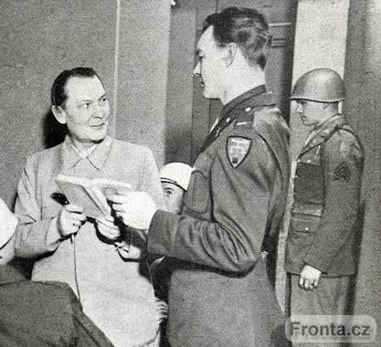 Nášivka s emblémem norimberského procesu na paži amerického důstojníka rozmlouvajícího s H. Göringem