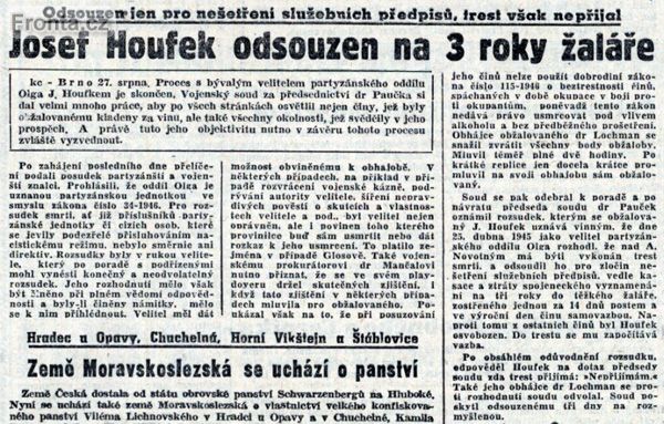 Celkově byla činnost partyzánského oddílu Olga velmi kontroverzní, zejména akce na opatřování kuřiva a alkoholu. Velitel „Pepek“ Houfek se silným sklonem k alkoholismu si navíc počínal velice brutálně a měl na svědomí životy i několika členů vlastního oddílu. Po konci války byl za své jednání dokonce dvakrát postaven před soud. Poprvé v roce 1946, kdy bylo zjištěno, že před svou „partyzánskou kariérou“ působil v německých ozbrojených silách. Mimořádným lidovým soudem byl však 26. listopadu 1946 osvobozen vzhledem ke svým zásluhám v boji proti okupantům. Podruhé byl postaven před vojenský soud v Brně v roce 1947 za zneužití velitelské pravomoci a 27. srpna 1947 odsouzen k trestu 3 roků žaláře (nízká výše trestu byla ovlivněna dobovou atmosférou). Protože dva roky si již odseděl ve vazbě, tak byl pro dobré chování okamžitě podmíněně propuštěn.
