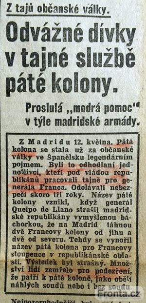 Protektorátní Večerní České slovo 12. května 1939 o termínu „pátá kolona“