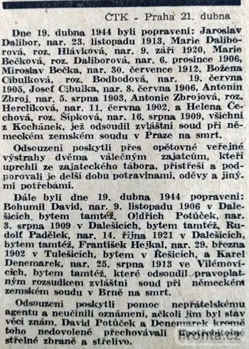 Odsouzení k trestu smrti byli popraveni v pankrácké sekyrárně 19. dubna 1944 v čase 16:25-16:35.