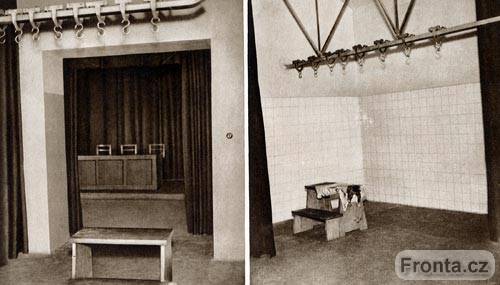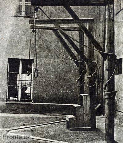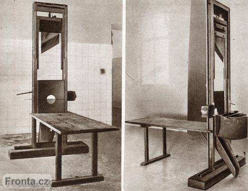 Popravčí stroj je prostý a důmyslný. Hlava přesahuje přes okraj lavice, čelo podepíná kožený pás, krk odsouzencův sevře „španělský límec“. Následuje dopad nože. Celý akt popravy trvá něco přes minutu, zapisovatel zaznamenává přesný čas. Vše se děje v poklusu. Muži jsou popravováni v civilních kalhotách, ženy jsou oděny v sukni a košili s velkým výstřihem. Vlasy mají ostříhány a nahoru vyčesány. Hlava popraveného spadne do připravené plechové nádoby. Mrtvolu odnesou pak katovi pacholci na nosítkách do třetí místnosti, kde jsou již připraveny bedny na tělesné pozůstatky. Uprostřed místnosti je kanálek, kde nebožtík dokrvácí. Hlava popraveného je položena mezi nohy. Odvoz těl popravených je proveden večer hromadně nákladními auty do strašnického krematoria, kde po provedené kremaci je popel naházen do společné jámy.“