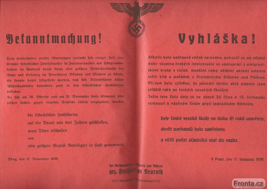 Příklad vyhlášky o uzavření českých vysokých škol z roku 1939,