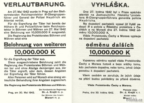 Příklad vyhlášky o odměně za dopadení pachatelů atentátu na Heydricha z roku 1942,