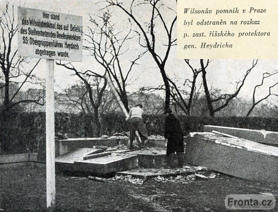 „Zde stál Wilsonův pomník, odstraněný na příkaz zastupujícího říšského protektora SS-Obergruppenführera Heydricha“. Prosinec 1941. Pomník byl obnoven v roce 2011.
