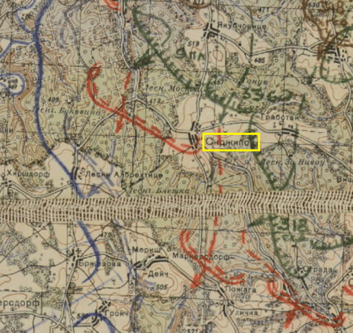Níže je výřez ze sovětské vojenské mapy, zobrazující postavení 9. plastunské a 336. střelecké divize na konci 28. dubna 1945 (zeleně) a na konci 29. dubna 1945 (červeně). Obec Skřipov jsem na mapce označil žlutě.