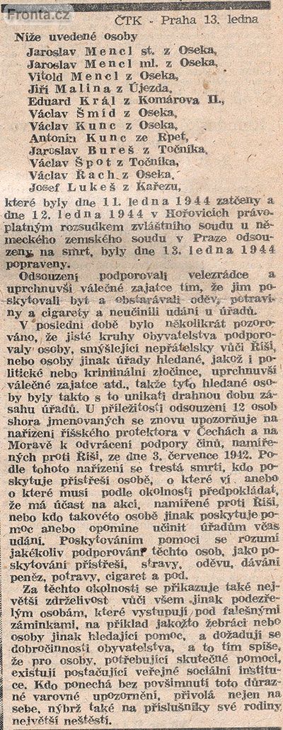 Zpráva ČTK v Lidových novinách 14. ledna 1944: