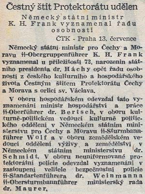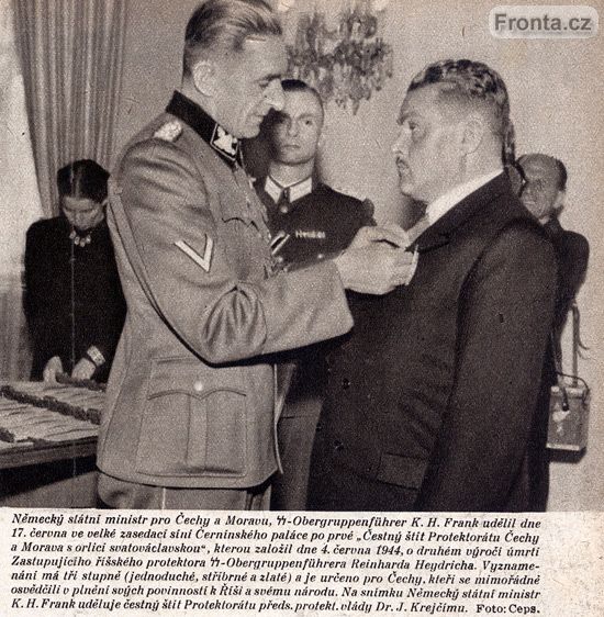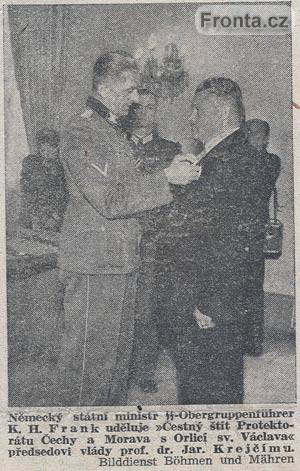 Udělení Svatováclavské orlice předsedovi protektorátní vlády dr. J. Krejčímu 17. 6. 1944
