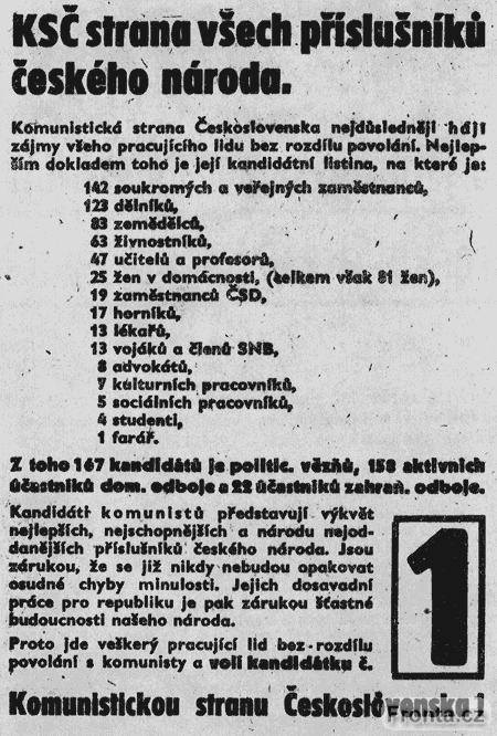 Počet členů KSČ na jaře 1946 dosáhl jednoho milionu, ČSNS měla asi 580 tisíc členů, soc. dem. 380 tisíc a lidovci 370 tisíc.