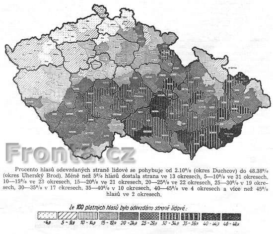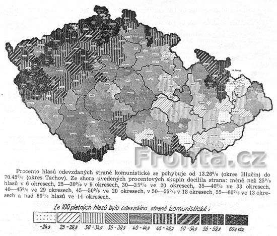 Zároveň je ale třeba dodat, že i v ostatních českých a moravských okresech se výsledek KSČ pohyboval mezi 25-45 %, což bylo ve většině případů více než u konkurenčních stran. Nejhoršího výsledku KSČ dosáhla v okrese Hlučín (pouze 13,26 %), nejlepšího pak v okrese Tachov (70,45 %).