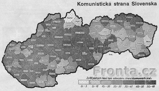 Na Slovensku, kde k tak rozsáhlým přesunům obyvatel nedošlo, byla podpora Komunistické strany Slovenska rozložena více rovnoměrně včetně jižních oblastí obývaných Maďary. Výrazně vyšší byla pouze v některých okresech na středním Slovensku a znatelně nižší na východě: