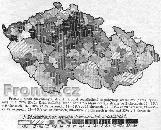 Mapa výsledků Československé strany národně socialistické (ČSNS) pak ukazuje, že největší podporu měla tato strana ve středních a východních Čechách, na Moravě a ve Slezsku pak ve statutárních městech Brně, Olomouci a Opavě. Národní socialisté byli výrazně městskou stranou, ve venkovských obvodech byly jejich výsledky slabší.