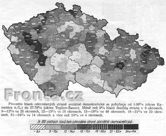 Výsledky Československé sociálně demokratické strany ukazují poměrně rovnoměrně rozloženou podporu, zvýšenou pak v části západních a severních Čech, na střední Moravě a na Ostravsku (tady vyhráli i v roce 1935):